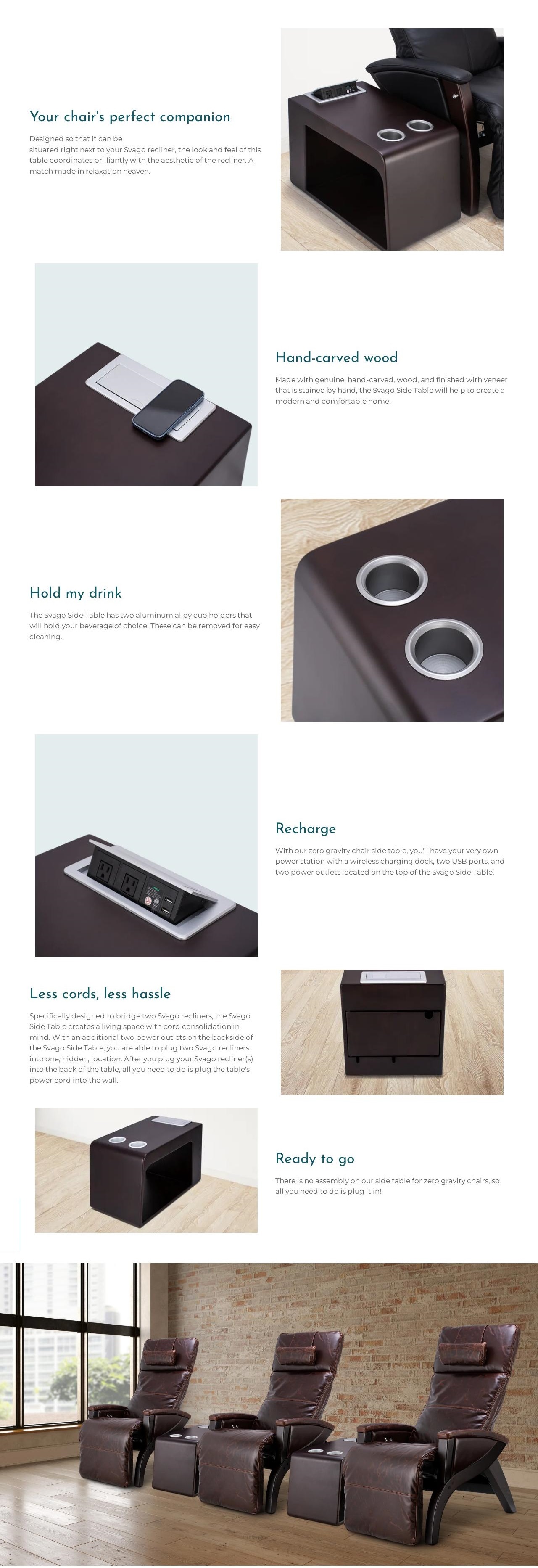 The Svago Side Table will perfectly compliment your Svago Recliner. With matching wood, you can put this table right next to your recliner, or create an entire relaxation living space by putting it in between two or more Svago recliners.
